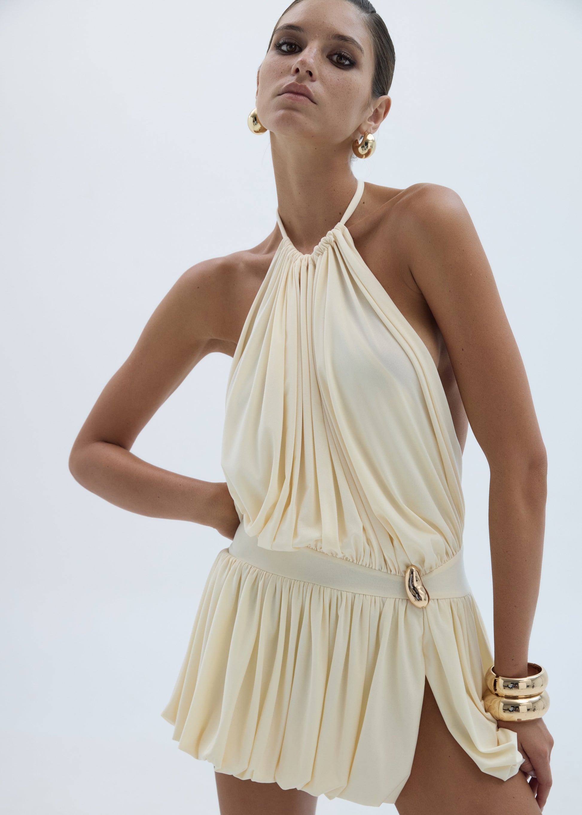 Anya Dress features backless halter mini with a gathered draped top and pleated skirt. Side slit with gold ring detail. Adjustable neck tie, back zip. Lightweight, fluid, minimal.