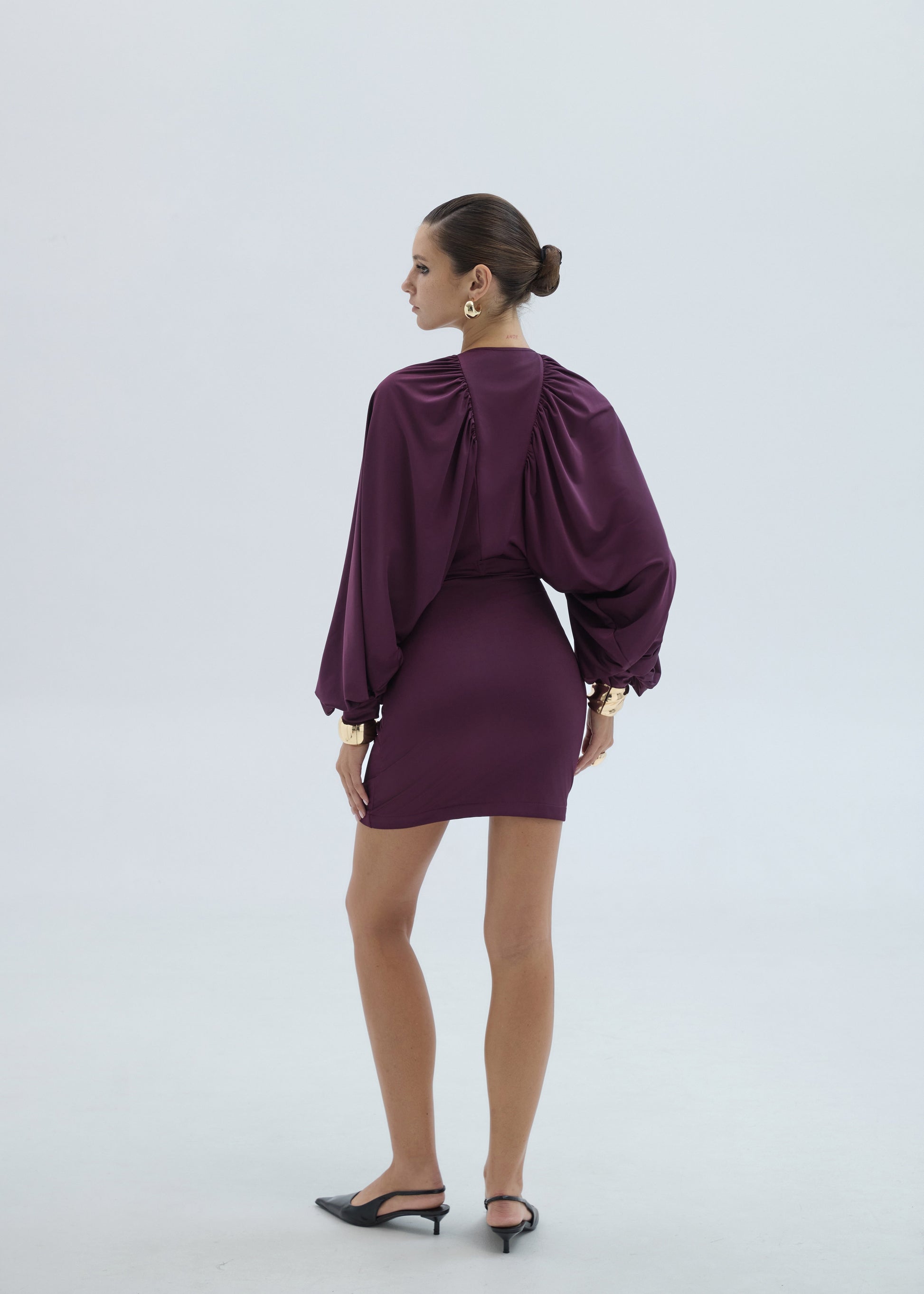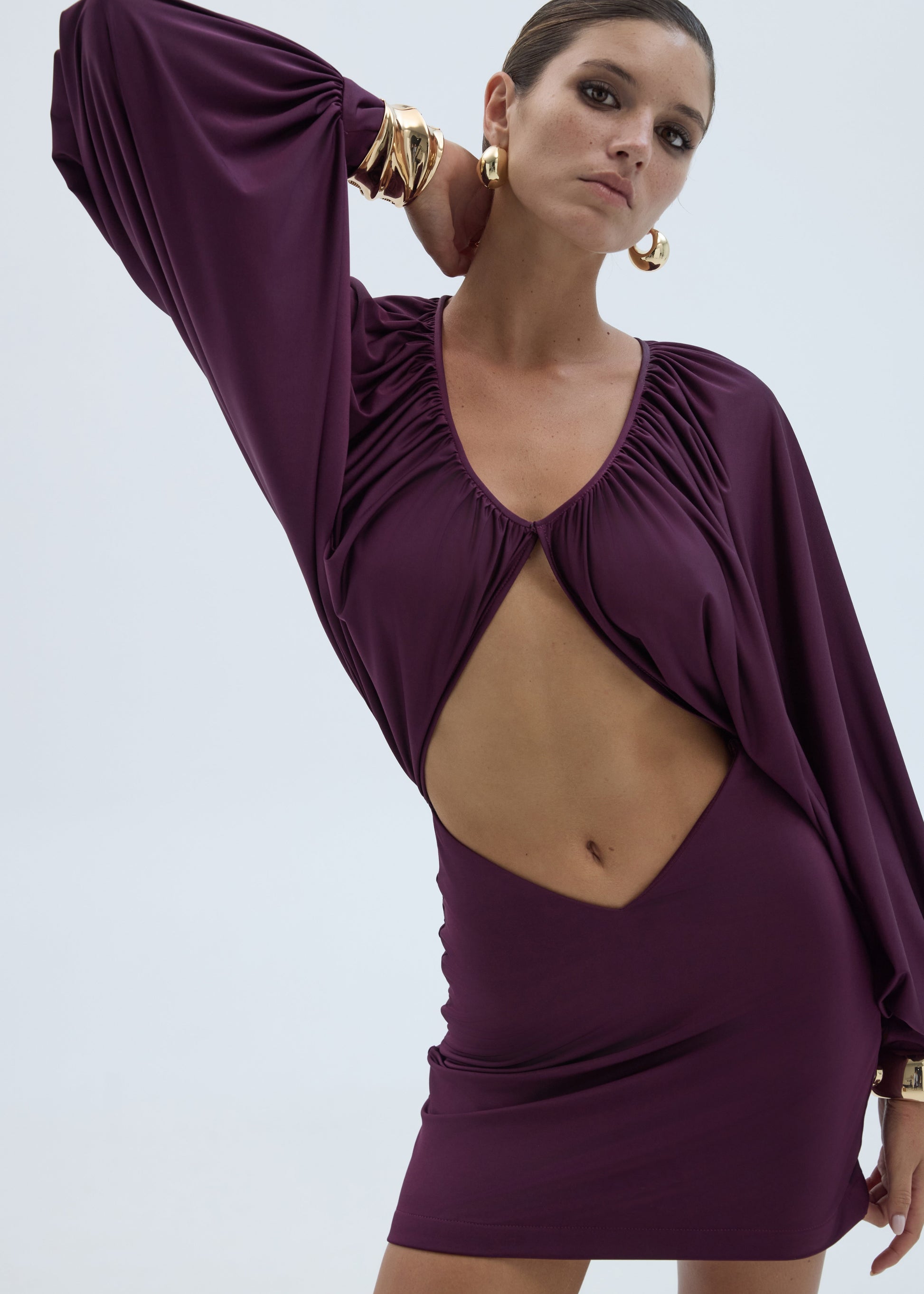 The Athea Dress features a gathered neckline with an open front cut-out and voluminous sleeves. Finished with a fitted mini skirt that defines the silhouette.