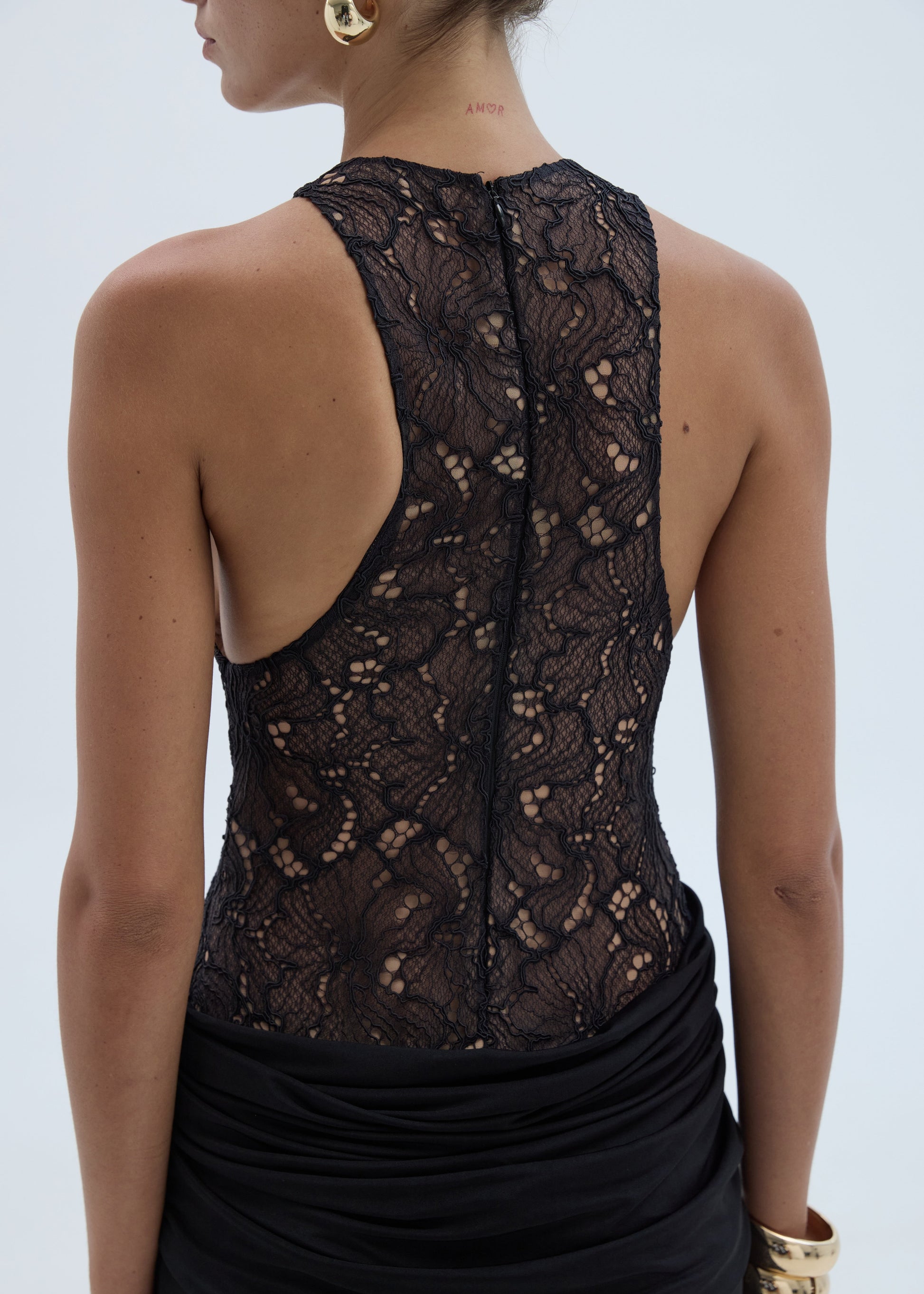 The Carmella Dress features a sleeveless lace halter bodice with an open neckline, fully lined for a non-transparent finish, paired with a floor-length skirt with a draped waist detail.